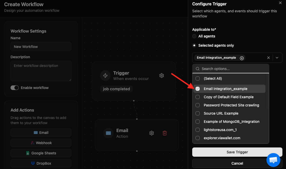 - Add triggers to enable the options, according to your requirement as instance: If you want to get notification when a web scraping job is completed, any errors found in logs etc…