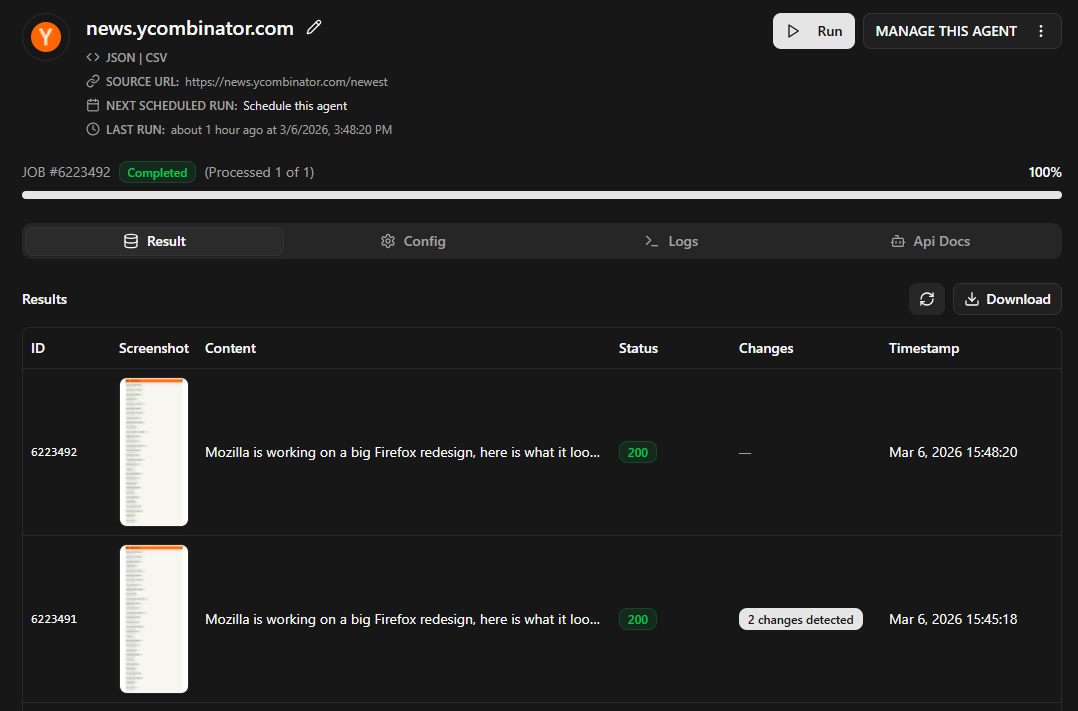 There are two ways to download screenshots using Agenty. If you have an agent running on a schedule, you can send requests to the Agenty API to fetch the latest screenshot results and download them to your local directory. Alternatively, if you are a developer integrating screenshots into your application, you can use the Agenty /screenshots API to capture live website screenshots programmatically.