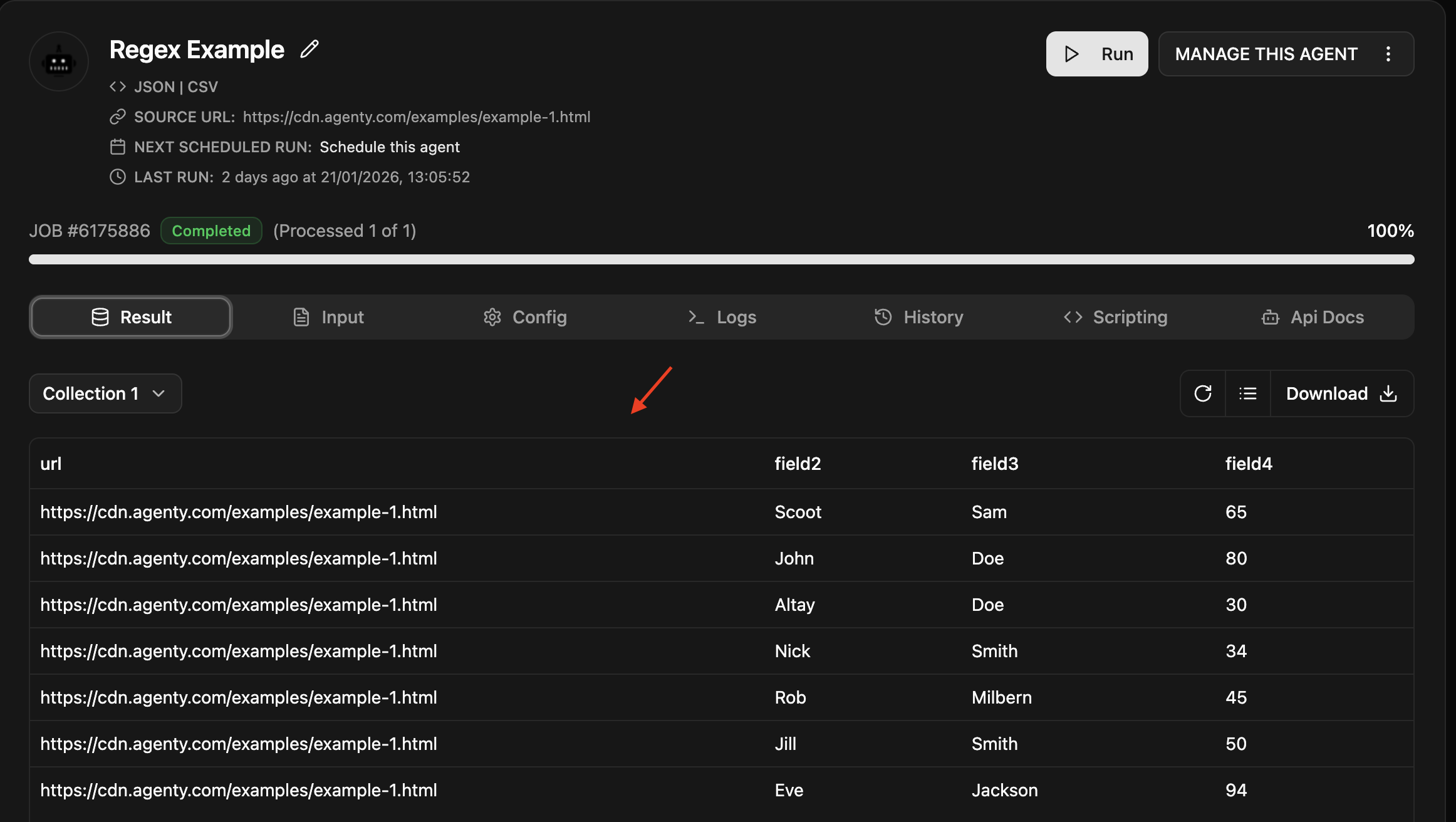Step 7 : Click on the Run button to start the execution of scraping agent and wait for the job completion. Once the job is completed you can see the extracted result as in screenshot below