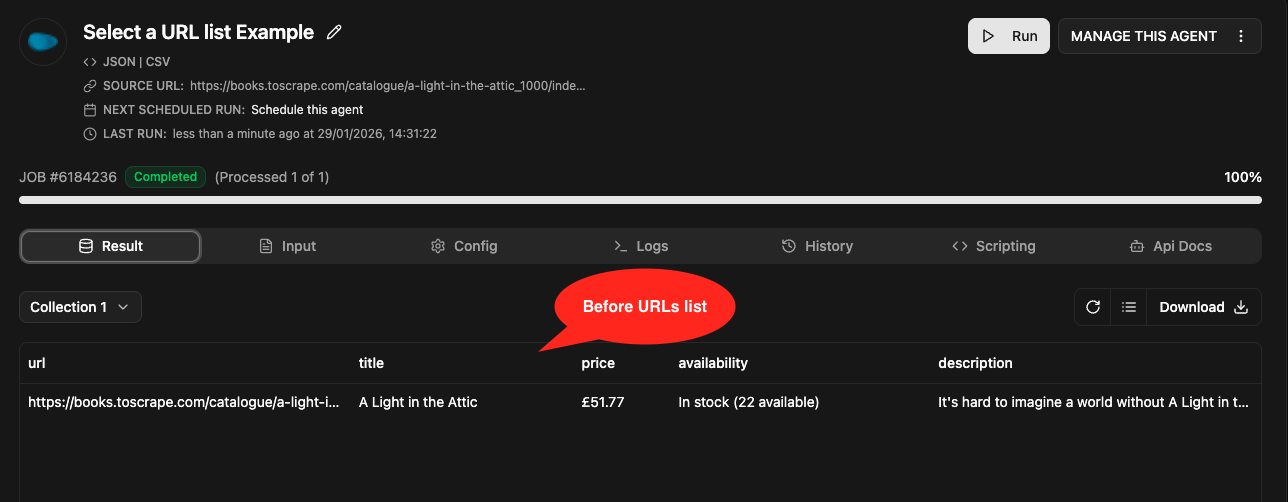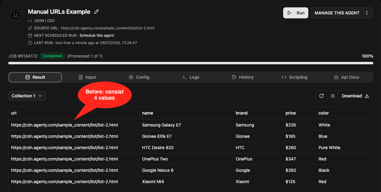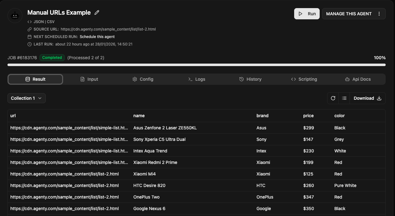 Now, I put manually all URLs in my scraping agent(Manual URLs Example) to get the same fields.