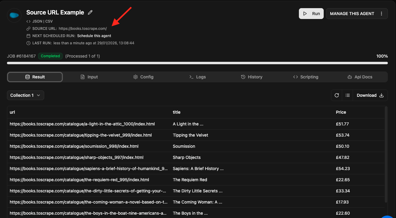 When we create an agent from a URL, this URL is known as the source URL for that particular agent. There is a mandatory source URL. We can only edit the source URL but not remove it. Here we have created an agent with 3 fields (url, title, price) as shown in screenshot below.