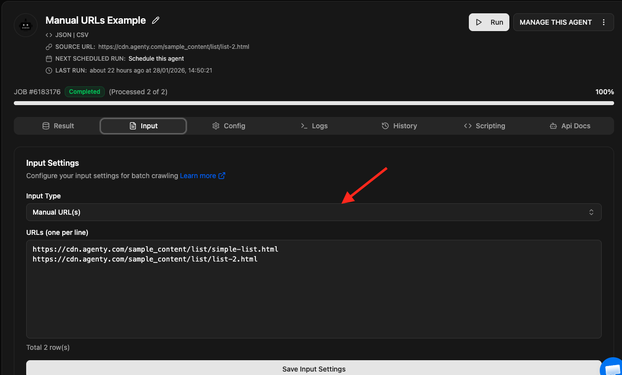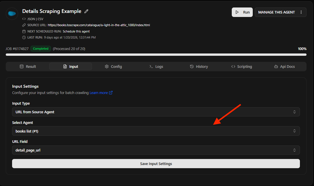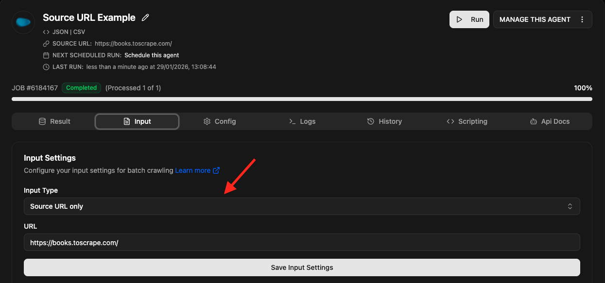 Savethe input configuration - Now, re-run the agent to execute the job for the selected source URL.