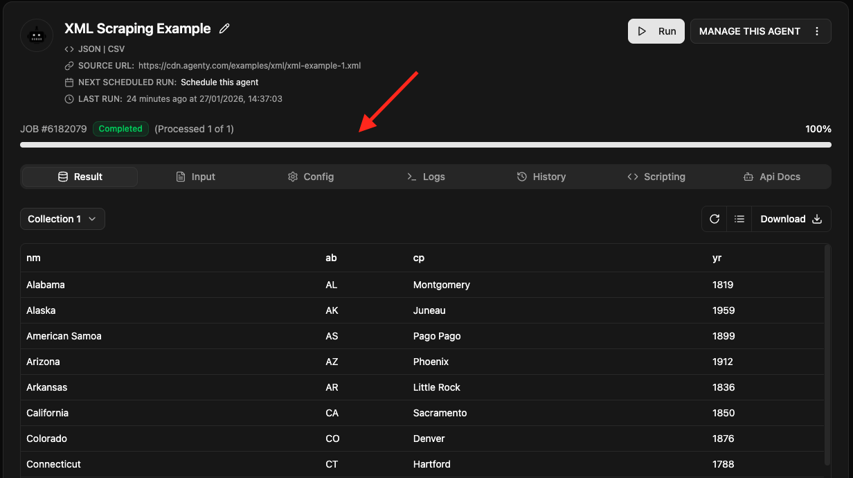 Once the job is completed, we can see the scraping agent result in structured format, by going to Result tab, and can add any number of URLs with similar structure of XML to scrape the XML pages or to run automatically using Agenty advance features or API to automate the XML scraping.