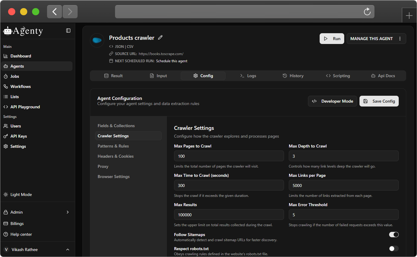 Agent begins crawling following your rules, respecting robots.txt and sitemaps.