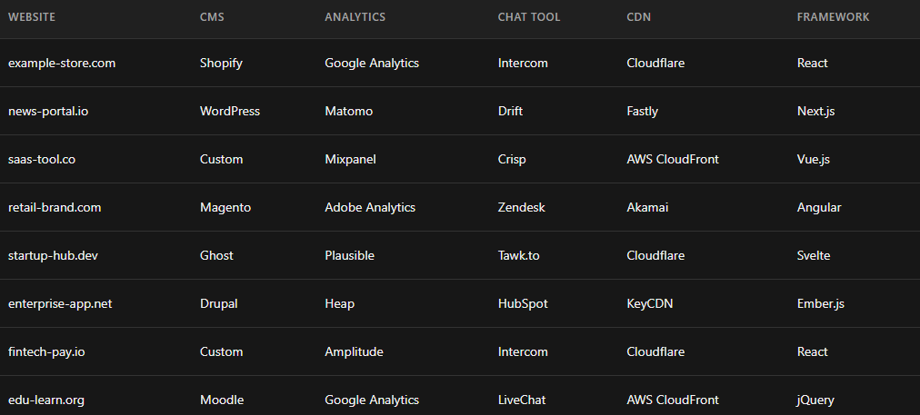 Detect the technology stack used on any website — CMS, analytics, chat tools, payment processors, and more. Power your competitive research, sales prospecting, and market analysis with technographic data.